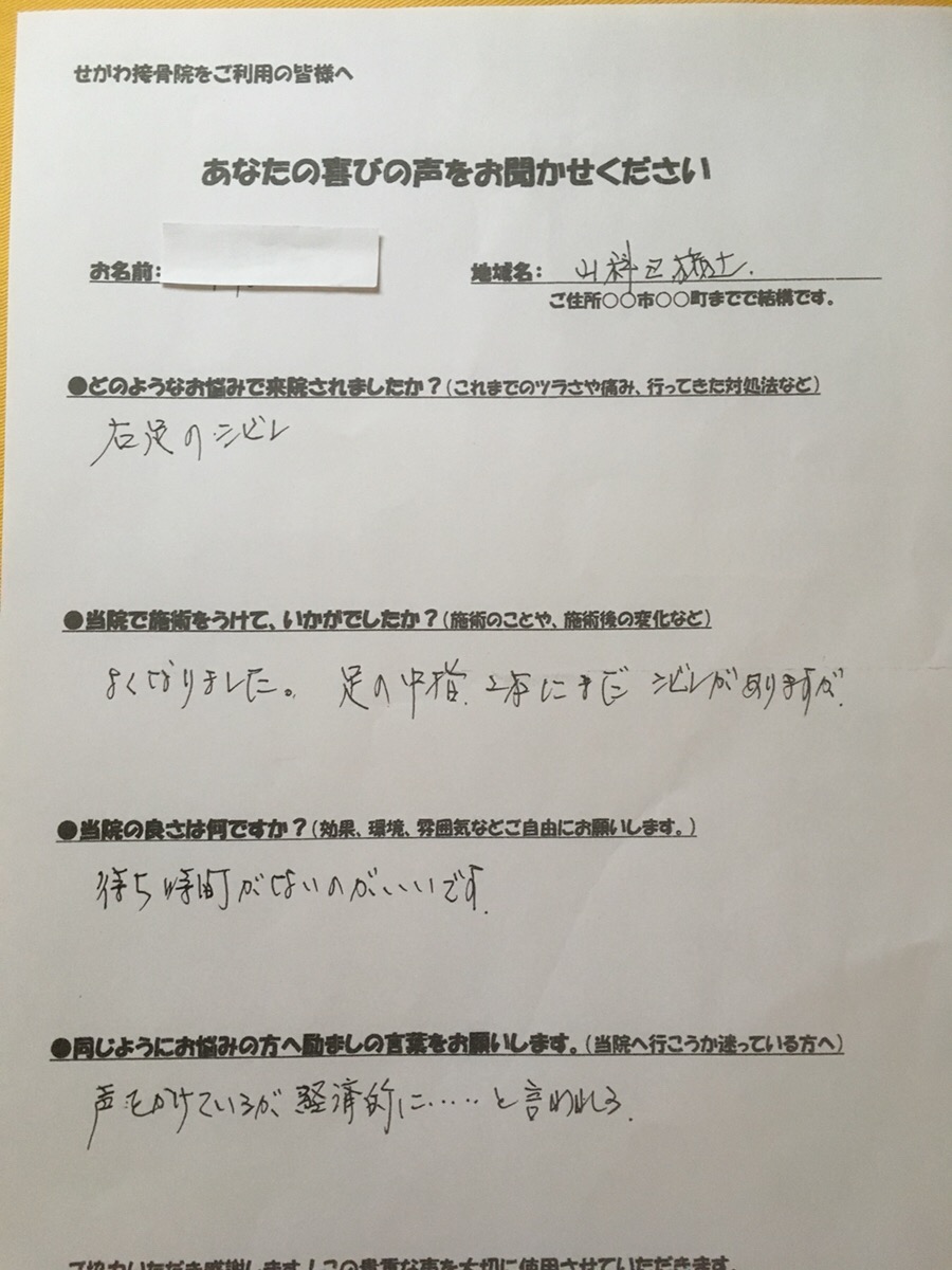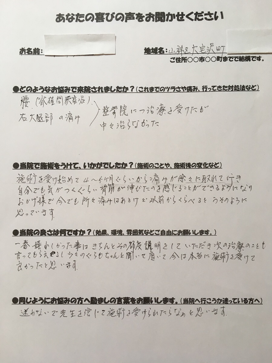 N.Y様 京都市山科区 腰・右大腿部の痛みが施術を受けて徐々に痛みが取れました!