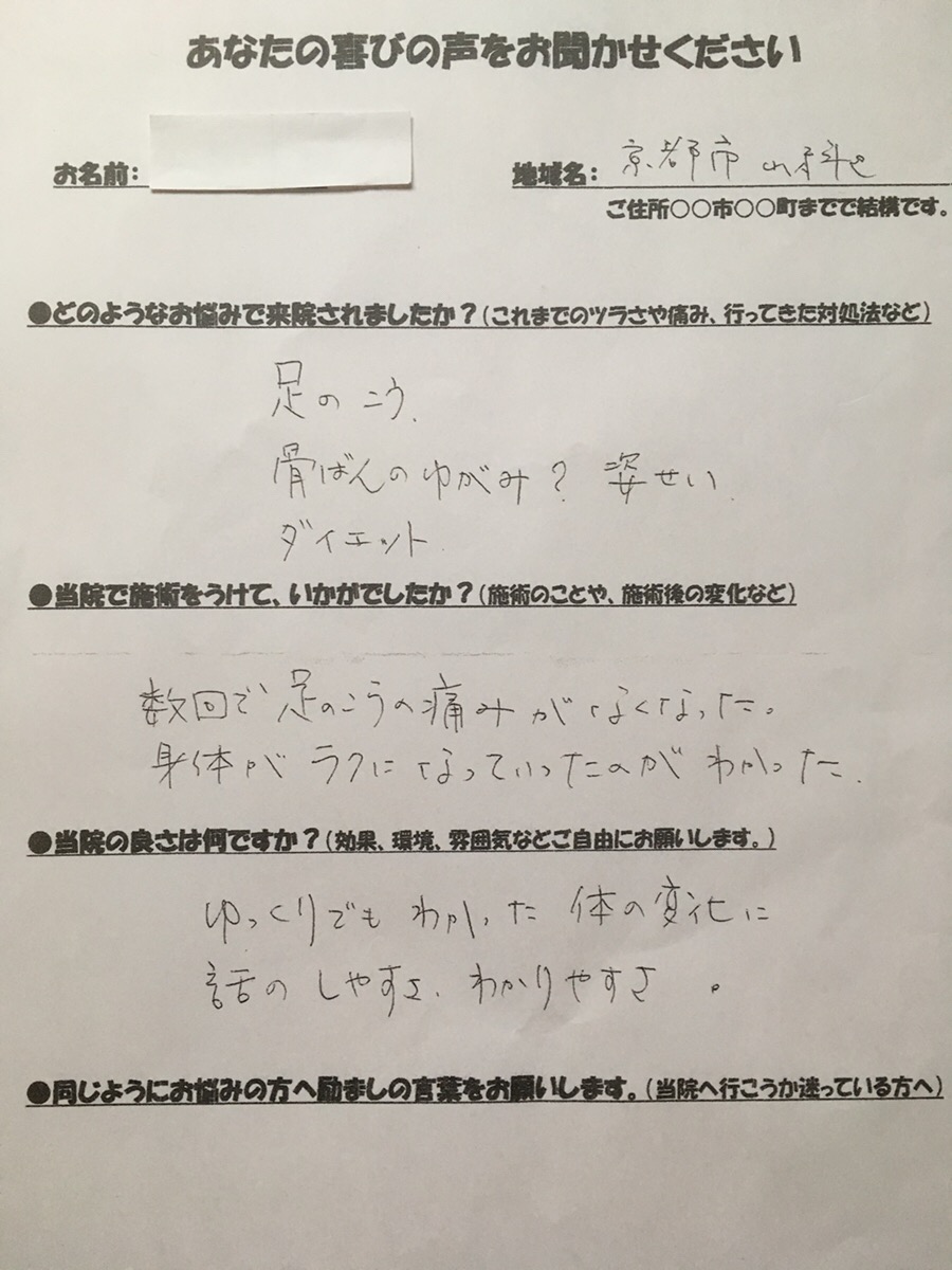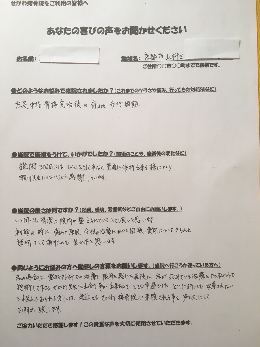 S.T様 京都市山科区 足指の骨折完治後、痛みで歩行困難だったけど施術3回目には普通に歩くことが出来ました!