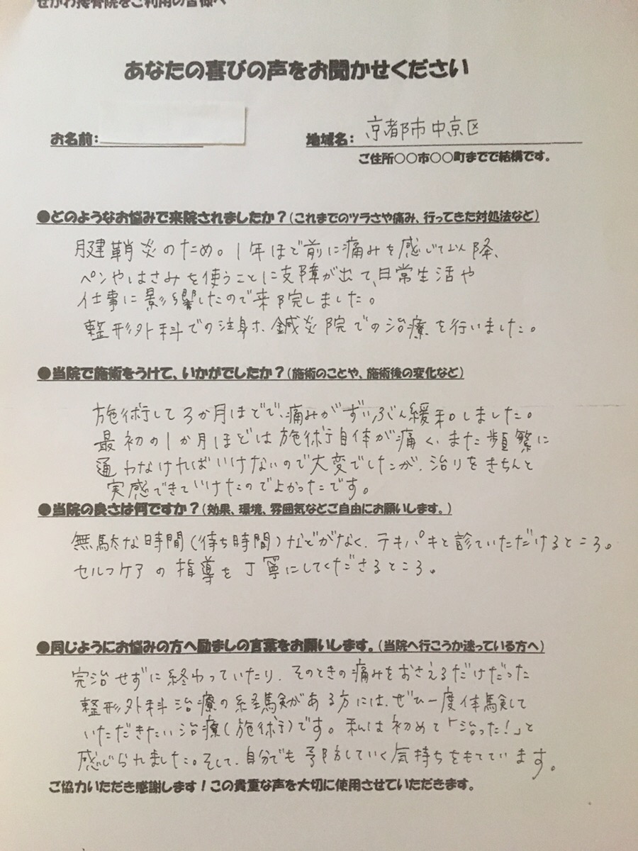 T.A様 京都市 腱鞘炎で仕事・日常生活に影響があったけど施術を受けて治りを実感できました!