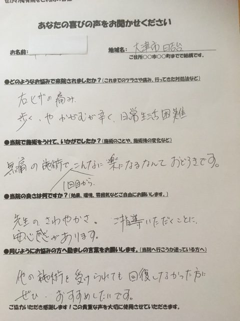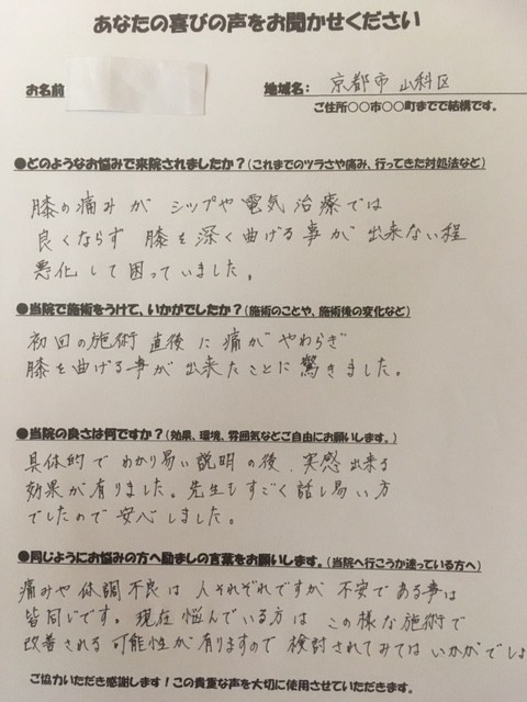 N.T様 京都市山科区 膝の内側の痛みが細かい関節の施術を受けた後は痛みが随分とひきました!